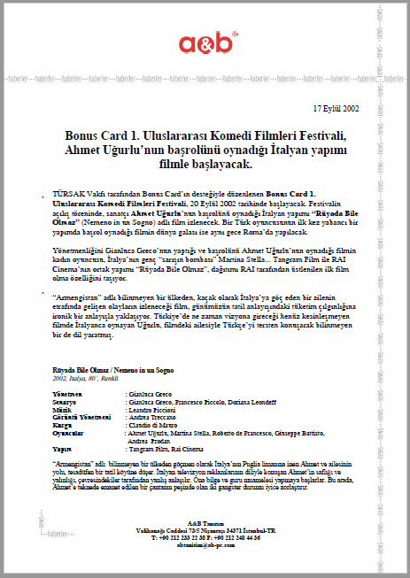 | Titolo originale: Nemmeno in un sogno Paese di produzione: Italia Anno: 2002 Durata: 84 min Genere: commedia Regia: Gianluca Greco Soggetto: Gianluca Greco, Paolo Virzì Sceneggiatura: Dorianna Leondeff, Francesco Piccolo, Gianluca Greco Casa di produzione: Tangram Film, Rai Cinema Distribuzione in italiano: 01 Distribution Fotografia: Andrea Treccani Montaggio: Claudio Di Mauro Musiche: Leandro Piccioni