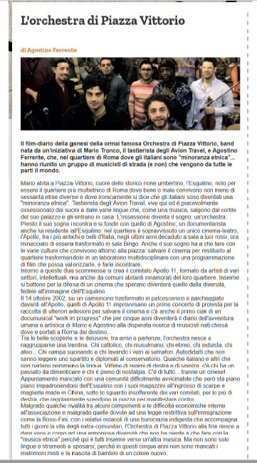 Il racconto di Agostino Ferrente nasce "L'Orchestra di Piazza Vittorio" A Roma Mario Tronco e Agostino Ferrente, in giro per l'Esquilino